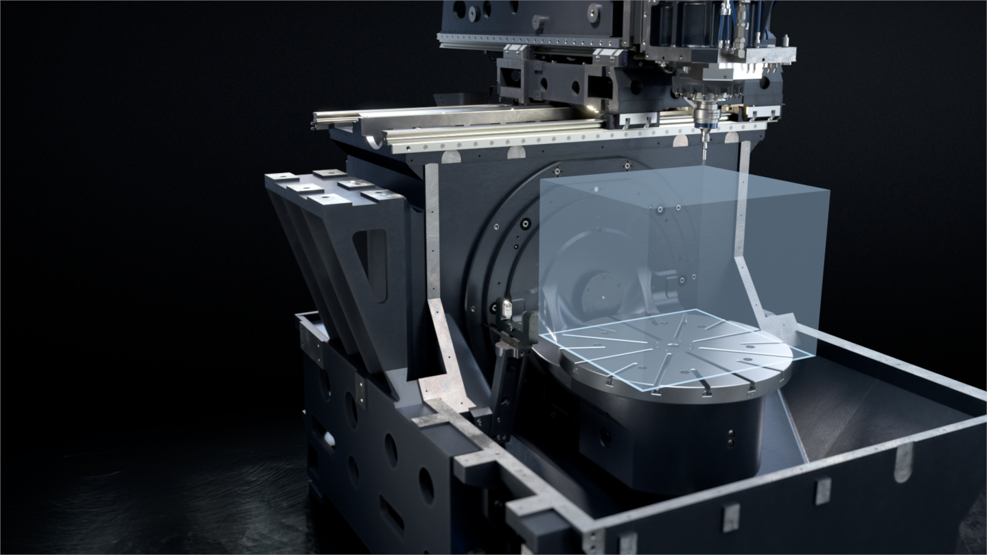 Tavola girevole/rotante con temperatura da -35° a +110° e asse C a trasmissione diretta con max. 300 giri/min, peso massimo del pezzo lavorato fino a 300 kg